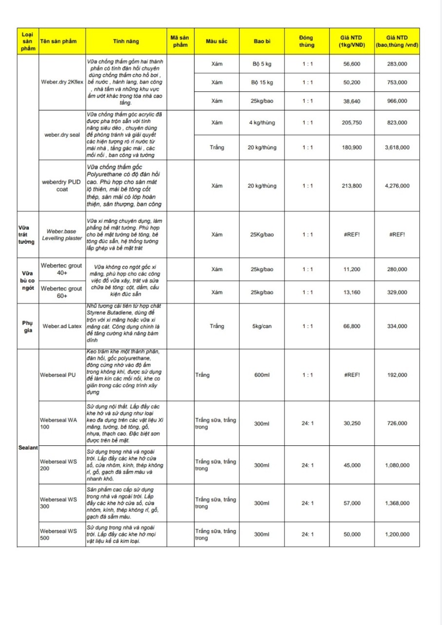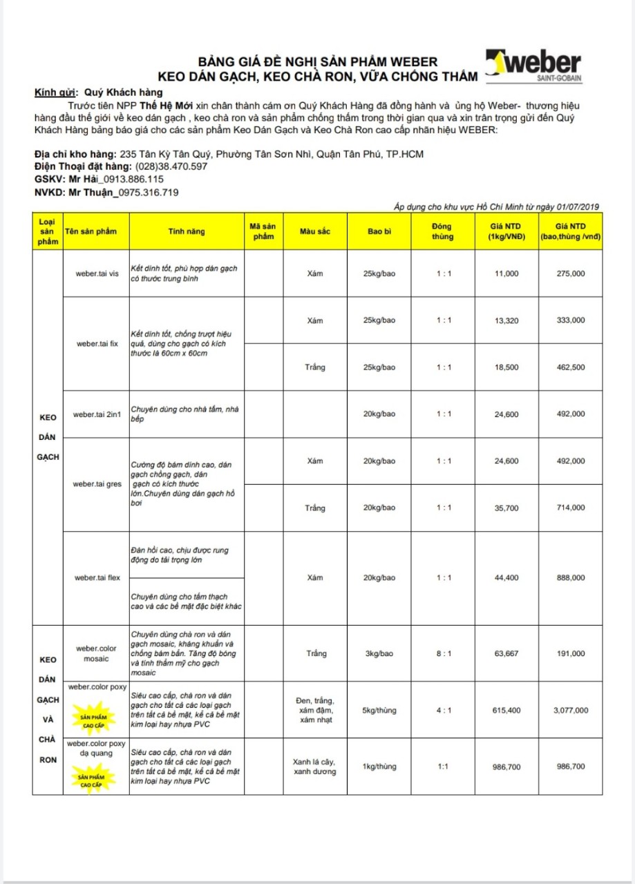 BẢNG BÁO GIÁ KEO CHÀ RON VÀ DÁN GẠCH WEBER NĂM 2020