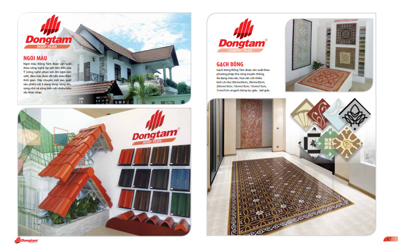 Với công nghệ phủ màu ép ướt tiên tiến của Ý (wet on wet – phun sơn khi ngói còn ướt) Ngói Đồng Tâm có độ bền lên đến 10 năm, màu sắc được bảo hành lên đến 05 năm. Sản phẩm đã có mặt tại nhiều công trình dự án lớn như: City Land Gò Vấp, Công an Bình Dương, Bệnh viên Đa Khoa Vùng Tây Nguyên, Đại học Tôn Đức Thắng.