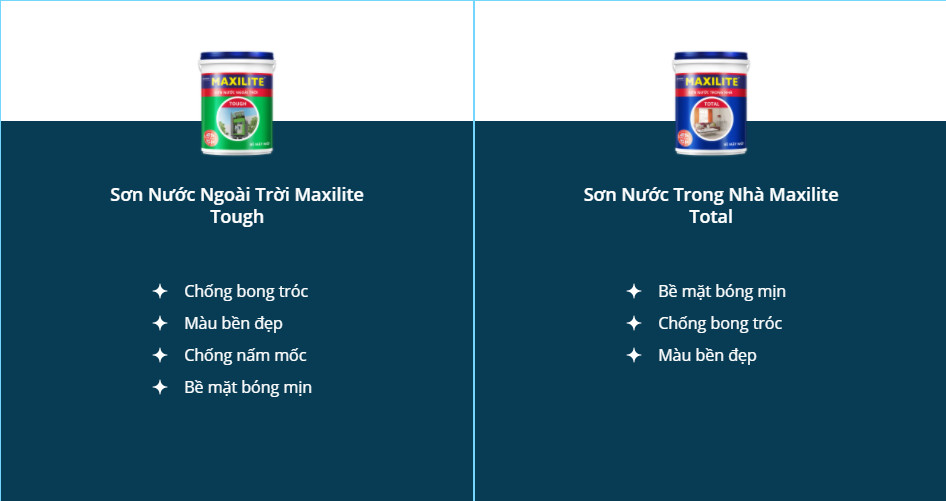 Maxilite được các thế thệ nhà thầu nhận biết và tin dùng nhiều nhất trong phân khúc trung cấp nhờ vào Công nghệ tiên tiến SuperLock giúp màu bền đẹp và chống bong tróc hiệu quả. Ngoài ra, Maxilite còn áp dụng quy chuẩn Nhãn Xanh Singapore cho tất cả sản phẩm sơn nước