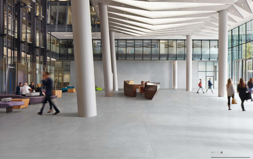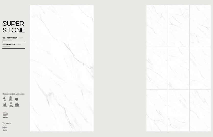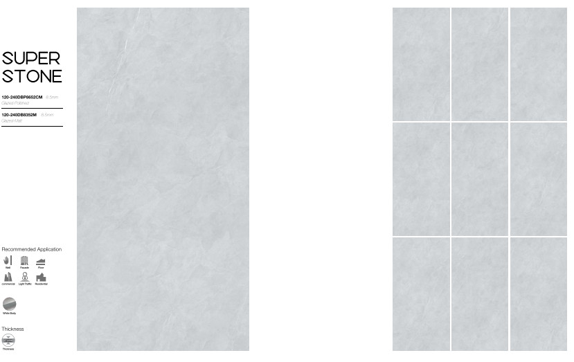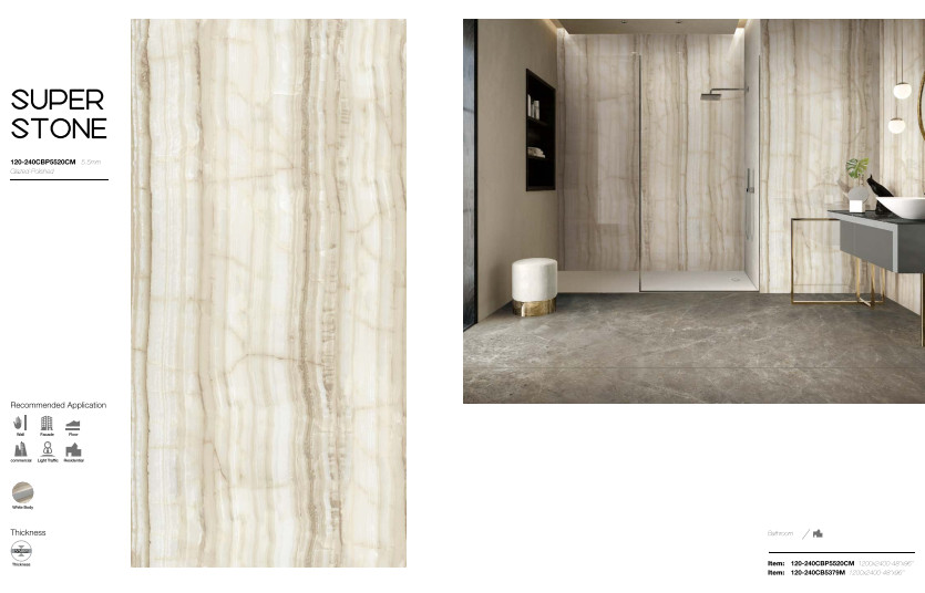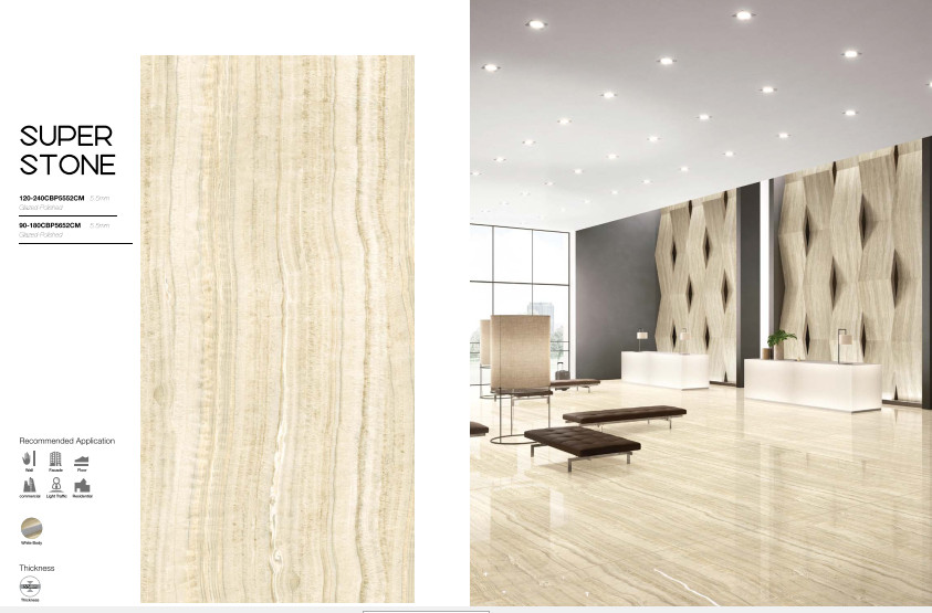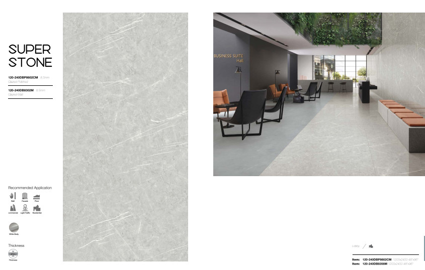 Xu hướng về gạch lát nền khổ lớn vẫn tiếp tục được chú ý với các kích thước như: 120x240cm, 120x260cm, 120x278cm hoặc 160x320cm. Lý tưởng cho các hành lang khách sạn cao cấp, các ứng dụng thương mại sang trọng hoặc có thể được sử dụng trong phòng khách, thậm chí phòng tắm như một tác phẩm nghệ thuật,.... giúp giảm mức chi phí đầu tư vì nó có thể được sử dụng mà không cần phải loại bỏ và xử lý bề mặt cũ.
