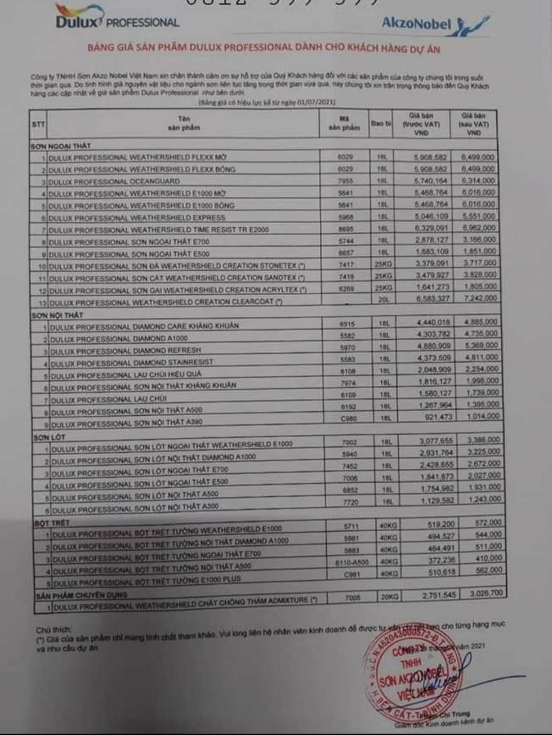 Quý Nhà thầu có nhu cầu sử dụng dòng sơn Dulux Professional chuyên cho công trình dự án. Xin vui lòng cho chúng tôi biết thông tin chi tiết về dự án (tên dự án, địa chỉ, nhà thầu, khối lượng dự kiến nếu có), để được báo giá tốt nhất.