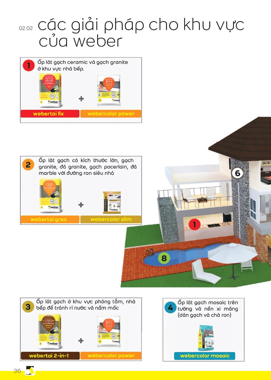 - Giải pháp ốp lát cho khu vực thông thường với điều kiện khô ráo và ổn định như phòng khách, phòng ngủ, phòng bếp: Sản phẩm keo dán gạch weber. tai vis, weber.tai fix