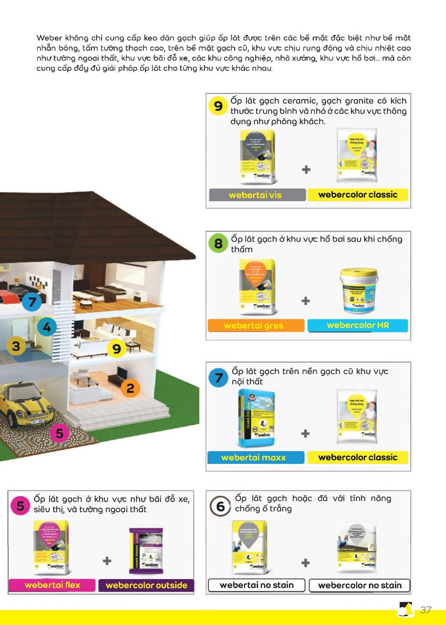 - Giải pháp ốp lát cho khu vực chịu thời tiết khắc nghiệt, tải trọng nặng và rung động cao như garage xe, trung tâm thương mại, nhà cao tầng, hay khu vực ngoài trời: Sản phẩm keo dán gạch weber.tai flex
