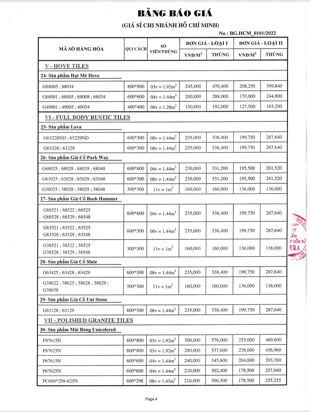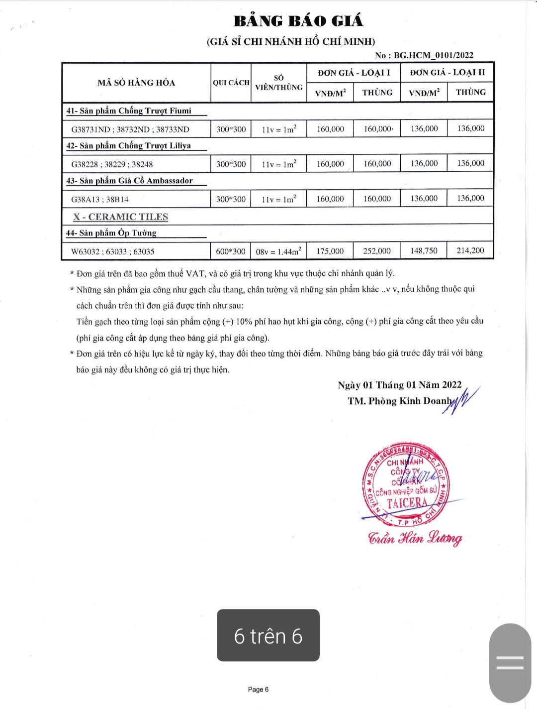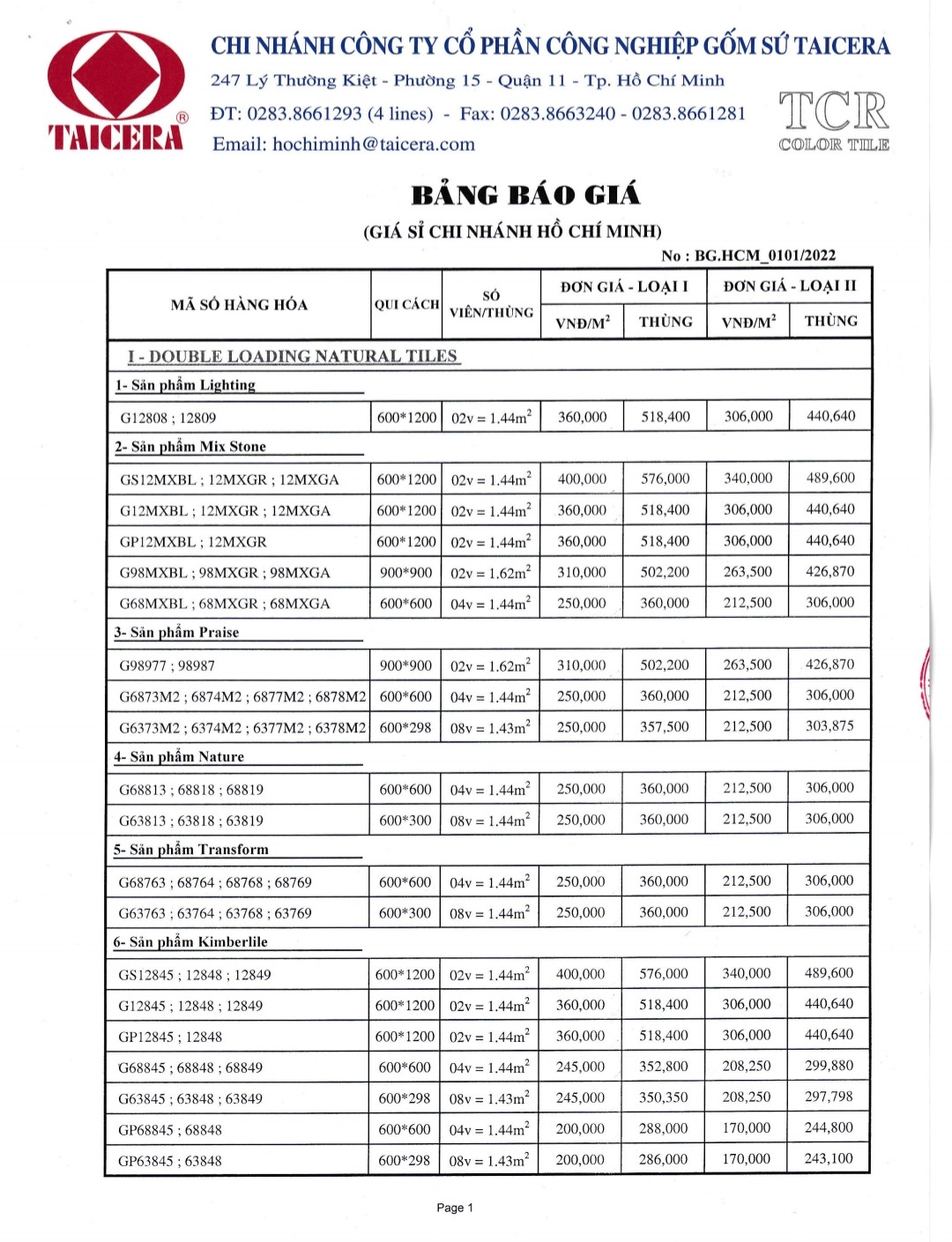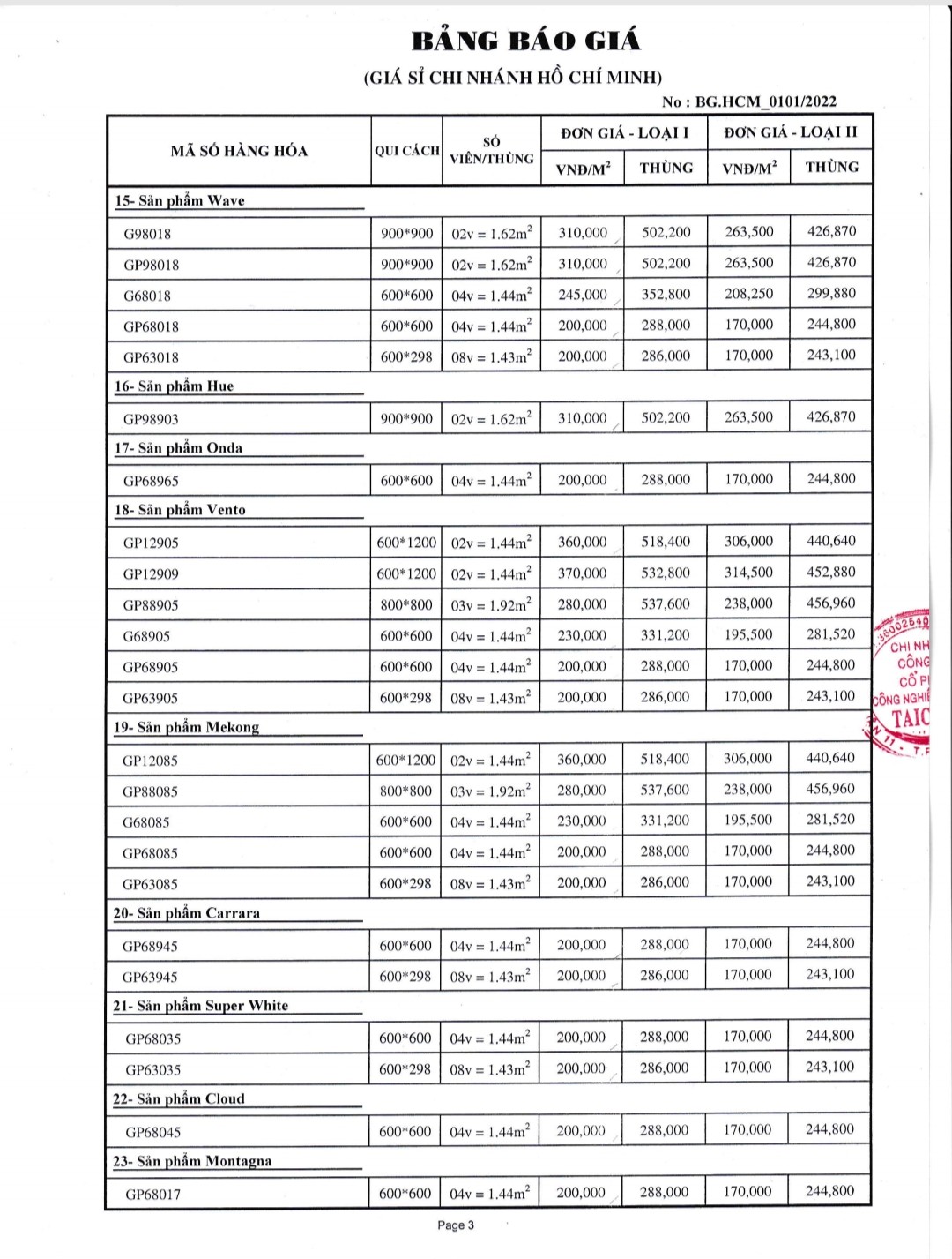 BẢNG BÁO GIÁ GẠCH TAICERA